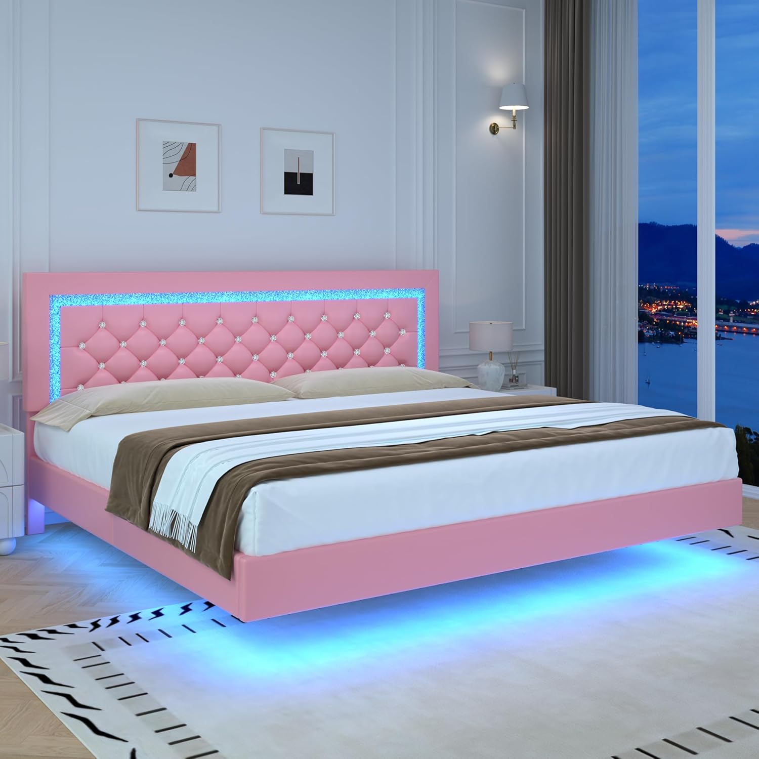 Pink Floating Platform Bed with LED Lights and Diamond Tufted Headboard