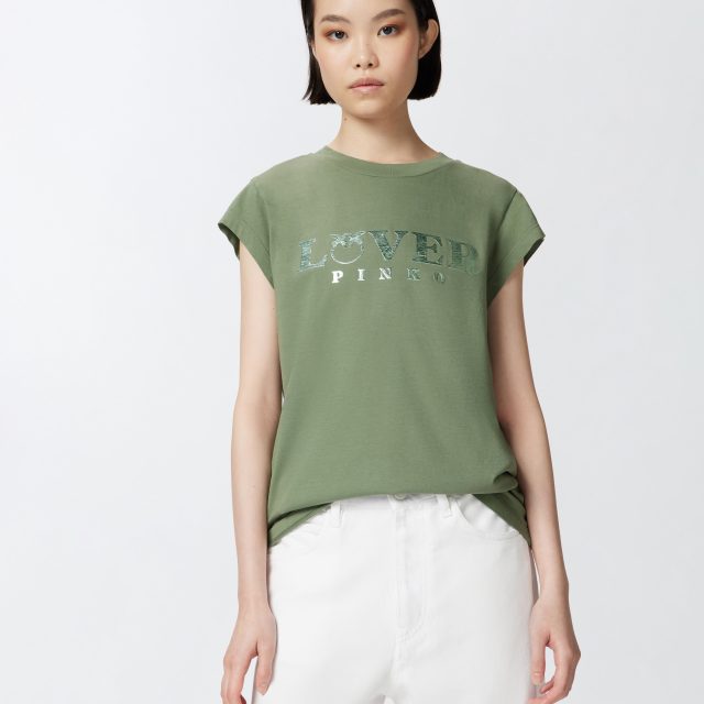 Refresh your spring wardrobe with this effortlessly chic PINKO women’s T-shirt, designed to bring personality and polish to your everyday looks. Crafted from soft, breathable cotton jersey, this piece feels light and comfortable against the skin while delivering a modern, feminine silhouette. The fresh green shade adds a lively touch, making it perfect for bright days and relaxed moments. At the center of the design is the iconic PINKO Lover print, finished with a glossy, almost metallic film that subtly reflects the light for a unique, eye-catching effect.