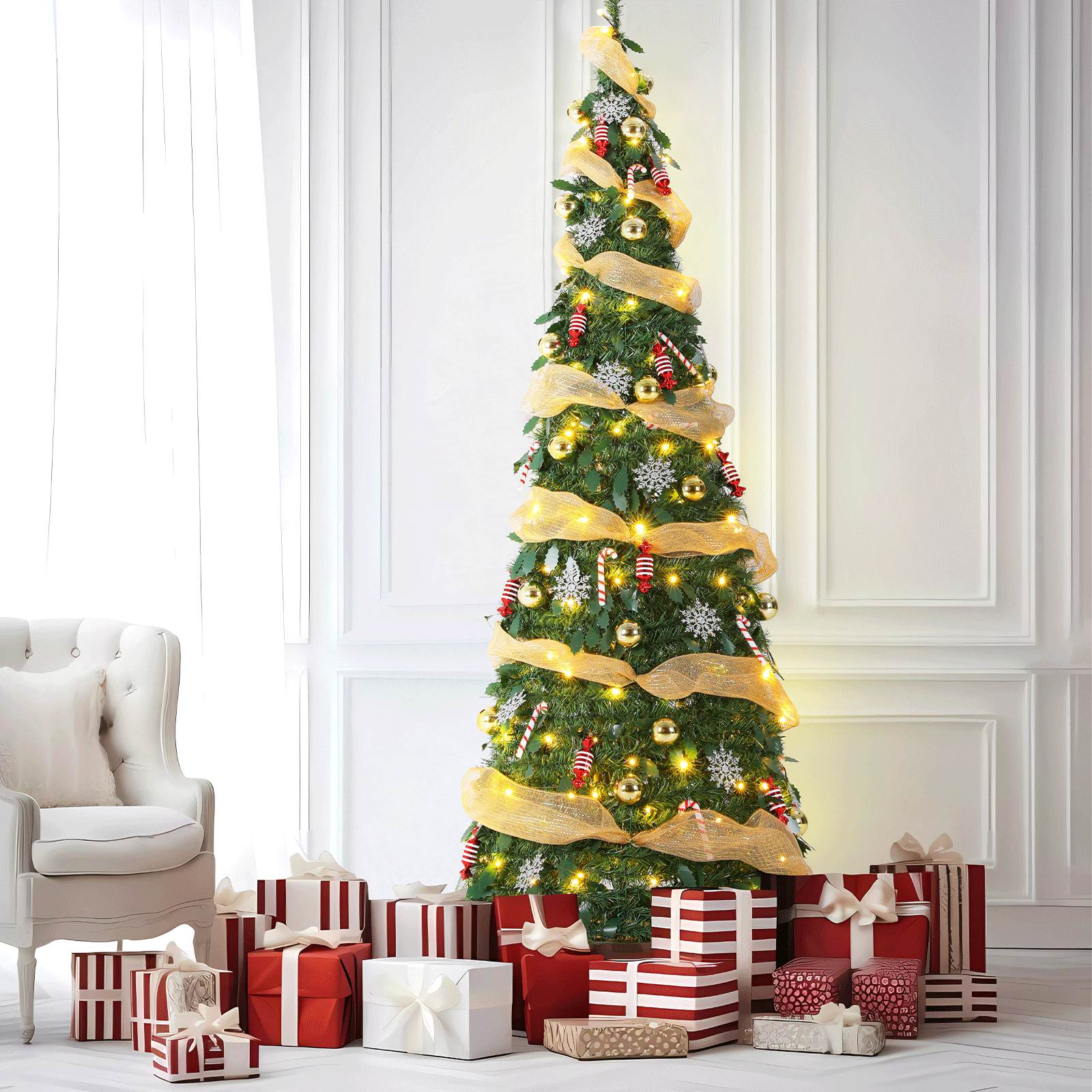 This tree comes pre-assembled with classic Christmas decorations, so you don’t have to spend hours hanging ornaments. Every detail is designed to give you a complete, polished look right out of the box.