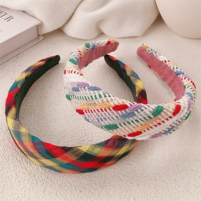 This headband stands out thanks to its unique woven texture and colorful checkered design. It combines comfort and decoration in one simple accessory. Unlike stiff hair accessories, this soft knit band adapts to your head shape while maintaining its stylish appearance.
