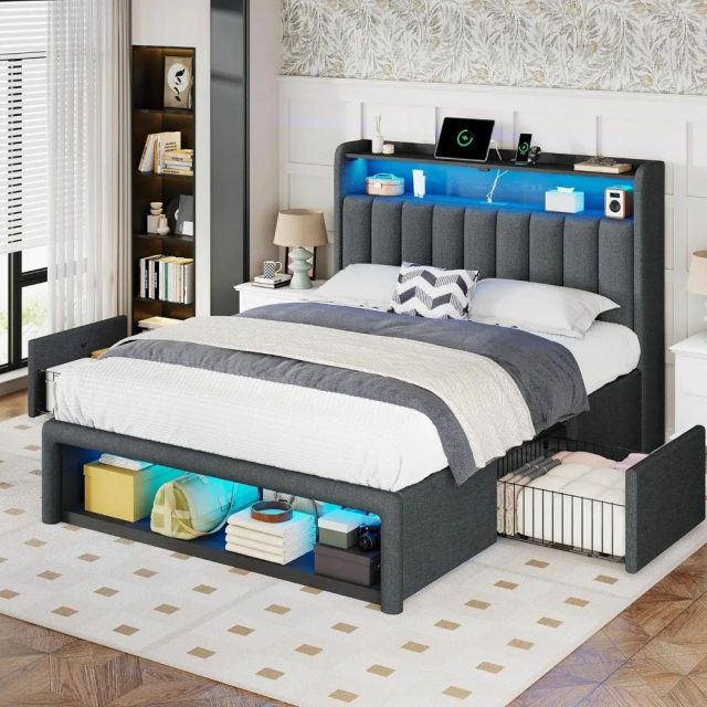 This queen bed transforms your sleep space from simply functional to fantastically multifunctional. The standout feature is its integrated smart RGB LED lighting built directly into the headboard and footboard. With a simple tap on your phone, you can bathe your room in calming blues for reading, energizing colors for your morning routine, or a soft glow for movie nights. It’s this seamless blend of high-tech features and practical storage that makes this bed a true centerpiece for the modern home.