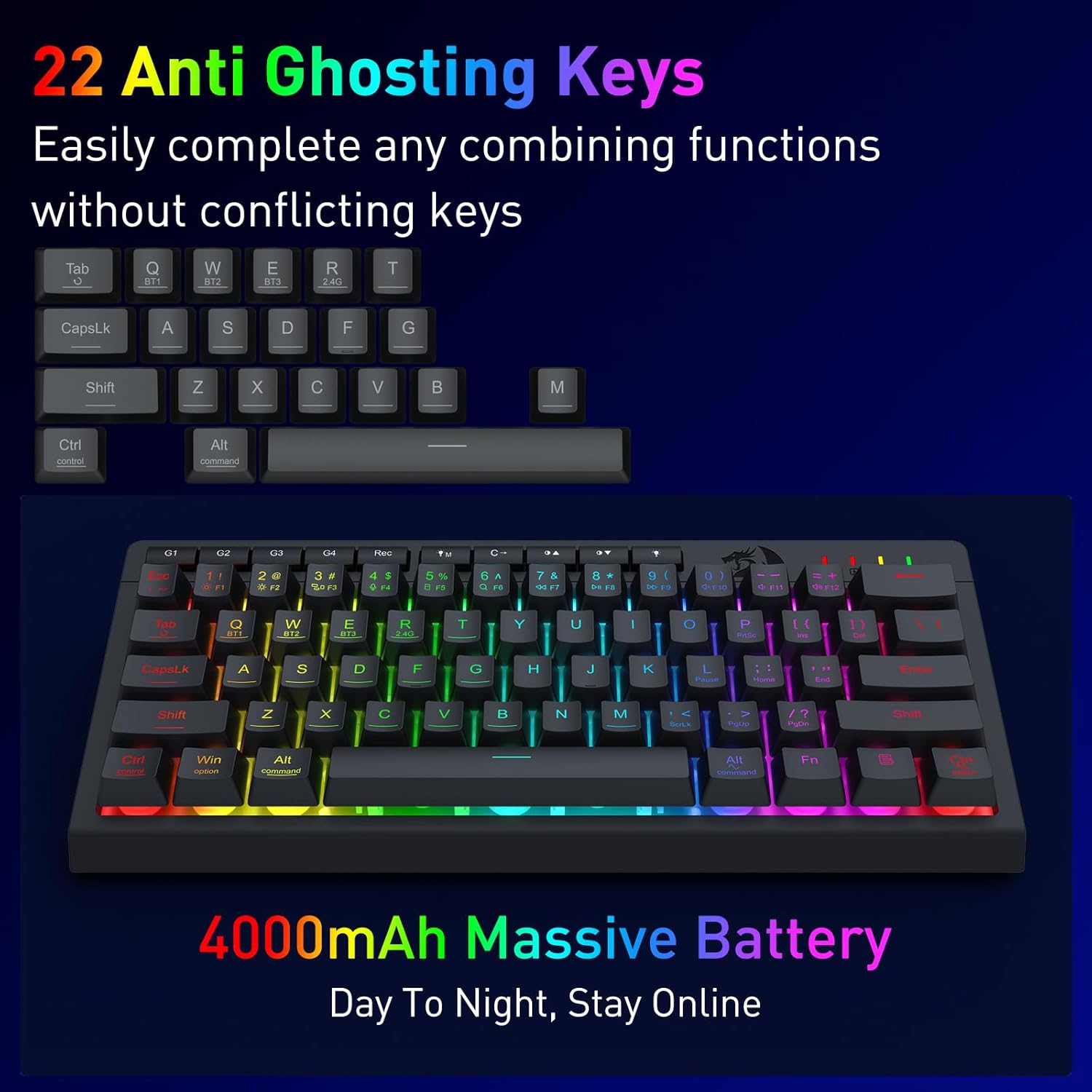 This keyboard combines a full suite of essential features to elevate your gameplay. The advanced 3-mode connection system lets you switch seamlessly between USB-C wired, Bluetooth, and 2.4GHz wireless, making it ideal for desktops, laptops, tablets, and more. Smooth linear mechanical-feel switches deliver quick, quiet responsiveness, while the vibrant RGB backlighting unlocks endless personalization with multiple presets and customizable slots.