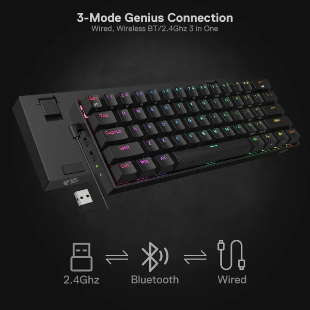 What makes this 60% wireless keyboard special? It’s all about the combination of cutting-edge features, high-end performance, and portability. The compact design allows you to maximize your desk space, ensuring you have room to move your mouse freely without feeling cramped. Whether you’re at home or at an event, this keyboard gives you the flexibility to switch between wireless and wired modes, so you can enjoy smooth, reliable gameplay in any environment.
