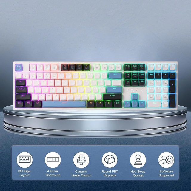 • Full-Size 108-Key Layout: Enjoy complete control with 104 anti-ghosting keys, enabling you to press multiple keys simultaneously without missing a beat. Plus, the addition of 4 extra programmable shortcut keys gives you more flexibility to navigate your workflow.