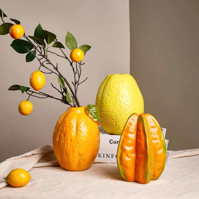 Brighten up your home with this delightful Resin Fruit Vase, designed in the playful shape of cartoon-style starfruit and lemon. Its cheerful design instantly adds a pop of fun and creativity, making it more than just a vase—it’s a conversation piece. Whether placed on a dining table, office desk, or shelf, it brings a unique blend of artistry and functionality to any setting.