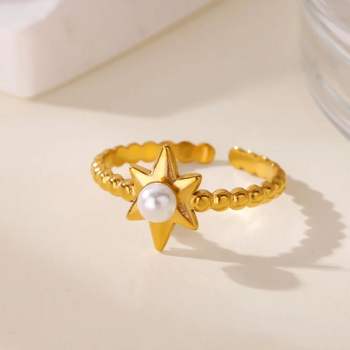 Stainless Steel 18K Gold-Plated Star & Pearl Open Ring for Women