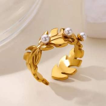 Stainless Steel 18K Gold Plated Leaf Pearl Open Ring for Women