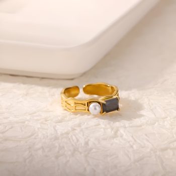 Gold Stainless Steel Zircon & Imitation Pearl Geometric Open Ring