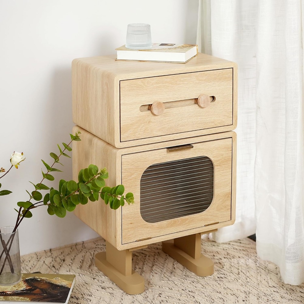 The rotating top lets you access your favorite items from any angle, adding ease and convenience to your daily routine. Its elegant glass door features a textured wave pattern, providing a sleek, contemporary look while keeping your belongings dust-free. A smooth drawer and roomy cabinet offer the perfect balance between display and storage, helping you organize essentials like books, remotes, or bedside accessories effortlessly.