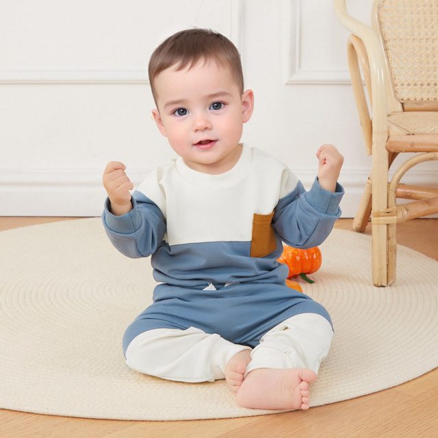 This two-piece outfit includes a long-sleeve sweatshirt and matching jogger-style pants, both crafted in a modern color-block design that adds a playful twist to classic babywear. The crew neck pullover ensures easy dressing, while the elastic waistband provides a snug yet flexible fit for all-day comfort. Available in multiple colors like black, blue, light gray-green, and blue-gray, this set pairs easily with your favorite baby accessories or shoes.