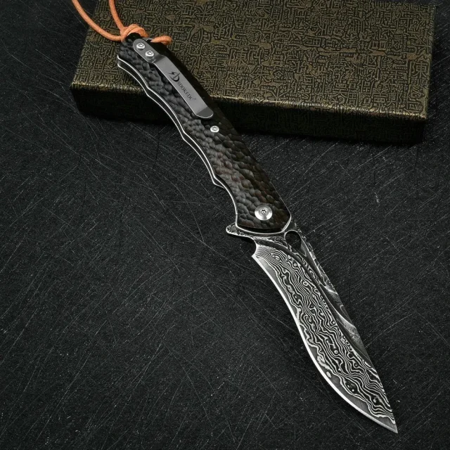 Designed with precision and reliability in mind, this folding knife features a smooth flipping mechanism that allows for quick one-handed deployment. Its compact size makes it an ideal choice for EDC (Everyday Carry), easily fitting in your pocket or pack without taking up too much space. The ergonomic hand-carved ebony handle ensures a comfortable grip during extended use, providing control and stability in challenging environments.