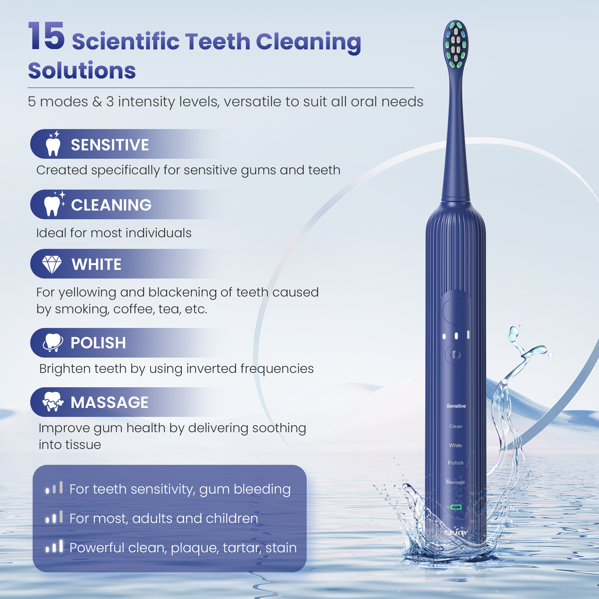 This toothbrush is ideal for daily use, morning and night, to maintain oral health, prevent plaque buildup, and keep your smile bright. It’s especially effective for those looking to remove stains, improve gum condition, or switch from a manual toothbrush to a more efficient, modern solution.