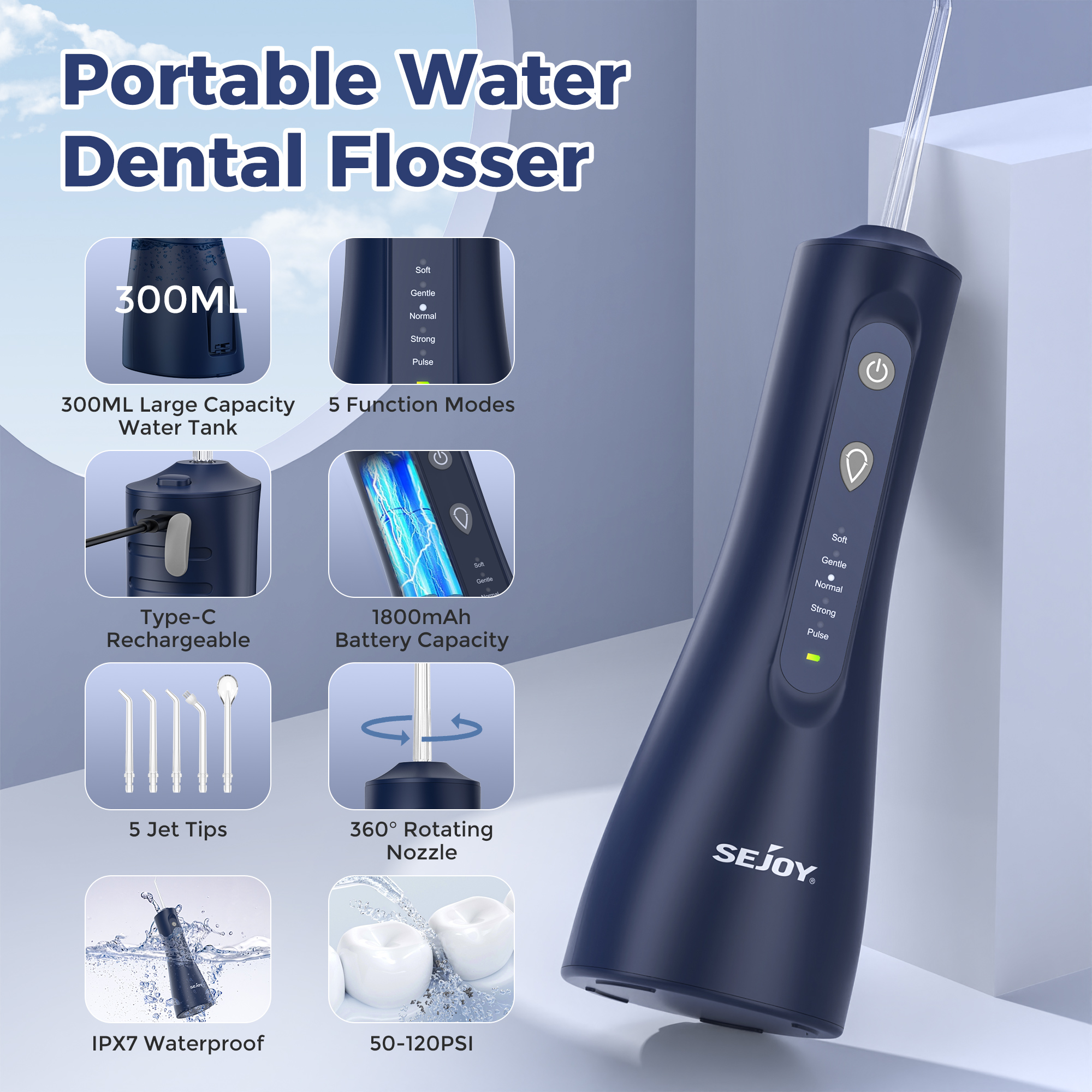 This water flosser is built with simplicity and efficiency in mind. It offers five customizable cleaning modes to suit different teeth and gum conditions, from sensitive care to deep cleaning. The detachable 10 fl oz (300 ml) water tank provides plenty of capacity for a complete flossing session, while the five included 360° rotatable jet tips ensure you can reach every corner of your mouth. Its IPX7 waterproof design means it’s safe to use in the shower, and with USB charging, you’ll always be ready to go.