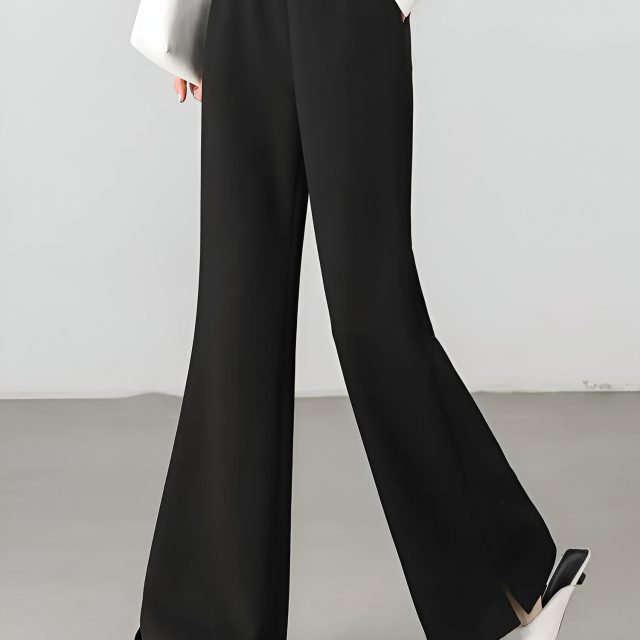 These trousers are crafted from a soft blended fabric with slight stretch, making them comfortable for long hours while hugging your shape in all the right places. The high waist design smooths and supports your midsection, while the flared leg balances your proportions for a flattering finish. The subtle split hem adds a trendy touch that sets them apart from basic office pants, making them suitable for both formal and semi-casual looks.