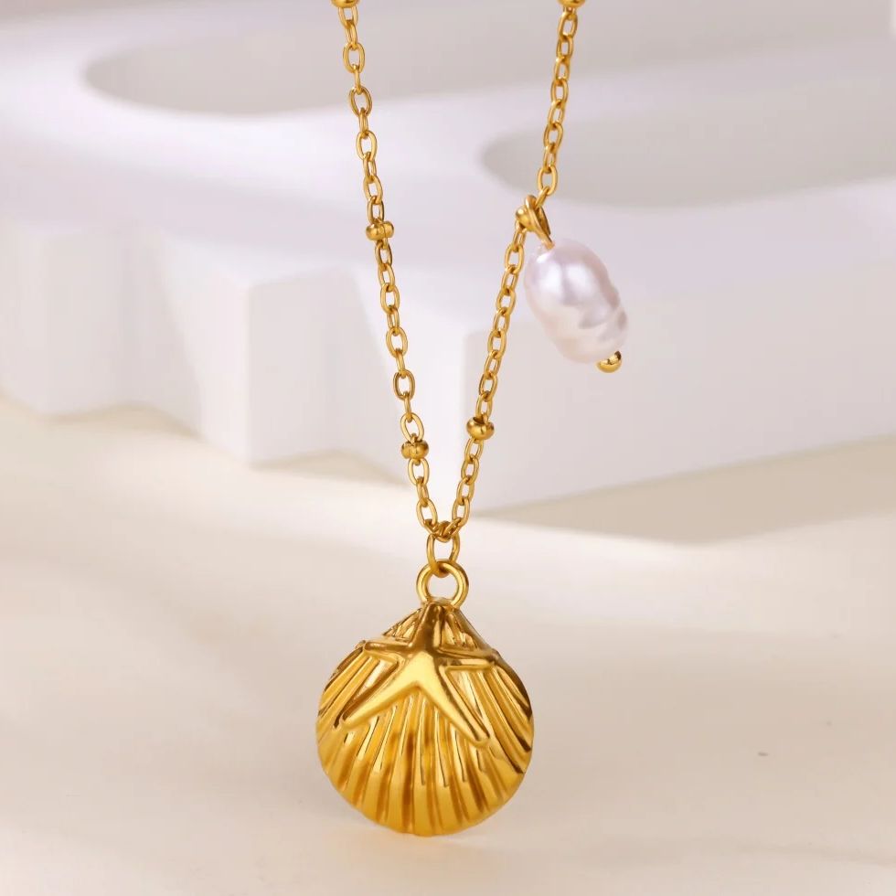 Bring timeless elegance and a touch of the sea into your style with this stunning Gold Shell Starfish Pearl Necklace. Crafted from durable stainless steel with a rich gold finish, it features a delicate shell pendant adorned with a luminous pearl and accented by a starfish charm. The result is a necklace that feels both vintage and sophisticated, making it a standout accessory for any occasion.
