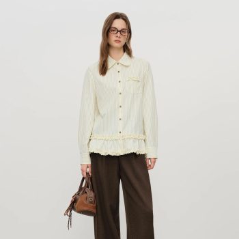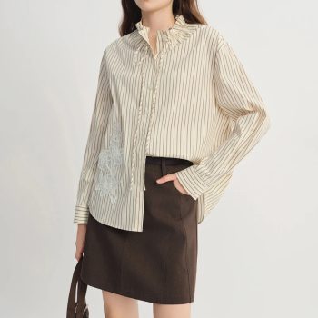 Striped Ruffle Long-Sleeve Lapel Shirt for Women