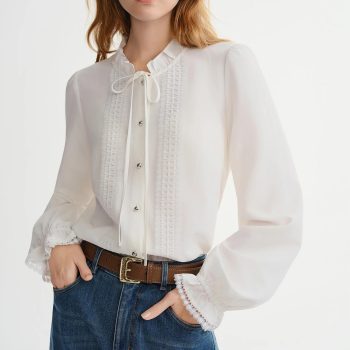 Plus-Size Women’s French-Style Wooden Collar Tie-Front White Shirt – Winter Top
