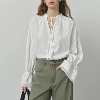 French Style V-Neck Lace-Up Casual Shirt for Women – Long Sleeve Blended Knit Top