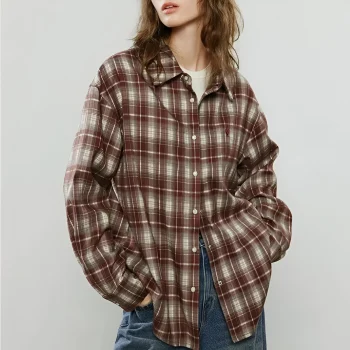 Women’s Retro Plaid Burgundy Flannel Blouse – Cozy Loose Fit Casual Shirt