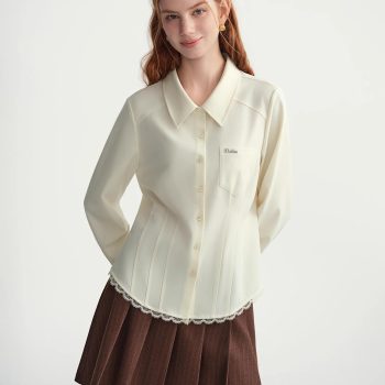 Plus-Size Lace-Trimmed White Blouse with Pleats – Slim Fit Casual Shirt for Fall & Winter
