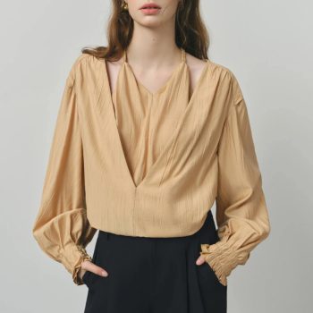 Women’s V-Neck Textured Halter Neck Pullover Casual Top