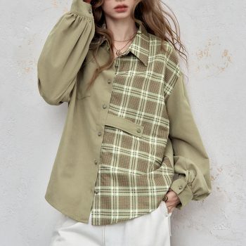 Casual Asymmetric Plaid Shirt for Women – Oversized Patchwork Long Sleeve Top