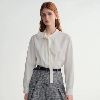 Plus-Size Women’s Casual White Bow Strap Shirt for Winter