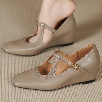 Women’s Sheepskin T-Strap Wedge Pumps – 2 Inch Heel Slip-On Comfort Shoes