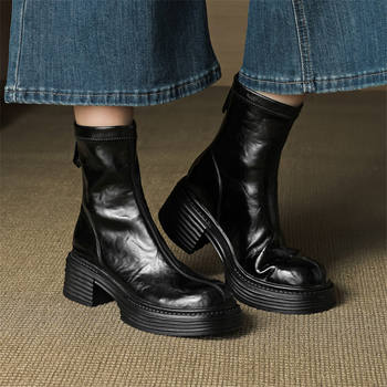 Retro Round Toe Leather Ankle Boots for Women – Zipper High Heels