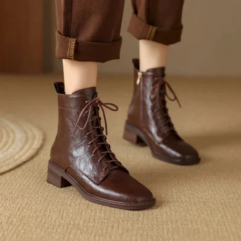 Genuine Leather Women’s Square Toe Ankle Boots – Handmade Low Heel Fashion