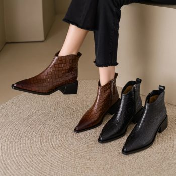 Women’s Pointed Toe Chunky Heel Leather Winter Ankle Boots