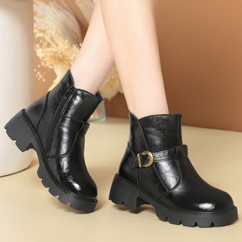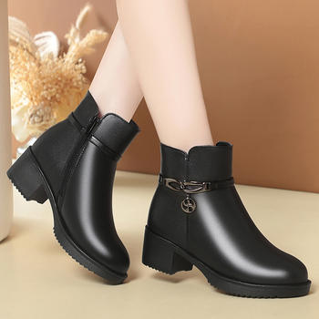 Winter Square Toe Chunky Heel Leather Boots with Warm Wool Lining