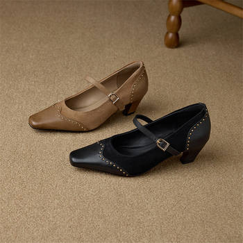 Genuine Leather Square Toe Mary Jane Heels with Rivet Detail
