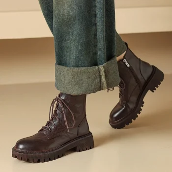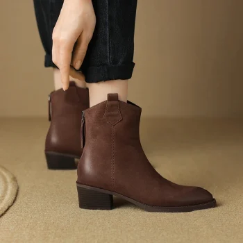 Women’s Retro Wool-Lined Leather Ankle Boots with Mid Heels