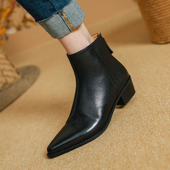 Winter Genuine Leather Pointed Toe Chunky Heel Ankle Boots for Women