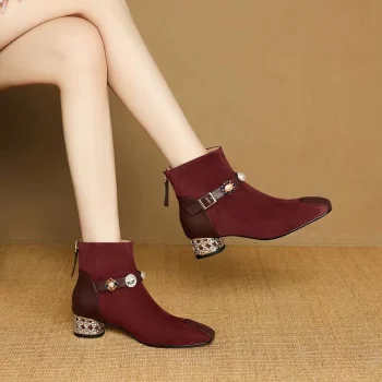 Women’s Suede Ankle Boots with Square Toe and Buckle Detail – Mid Heel Fashion