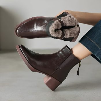 Winter Women’s Genuine Leather Ankle Boots with Wool Lining & Chunky Heel