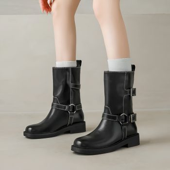 Winter Women’s Split Leather Mid-Calf Riding Boots with Chunky Heel