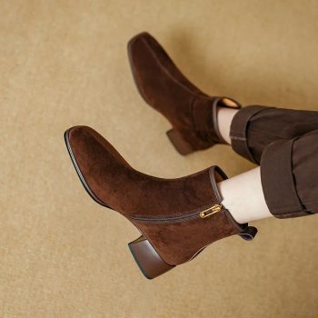 Retro Zip Ankle Boots for Women – High Heel Cow Suede Motorcycle Boots