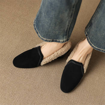 Winter Leather Wool-Lined Low Heel Indoor Slippers for Women
