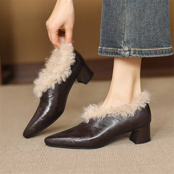 Winter Retro Pointed Toe Leather Loafers with Mid Heels for Women