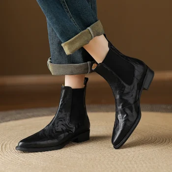 Women’s Winter Leather Ankle Boots Square Toe Chunky Heel