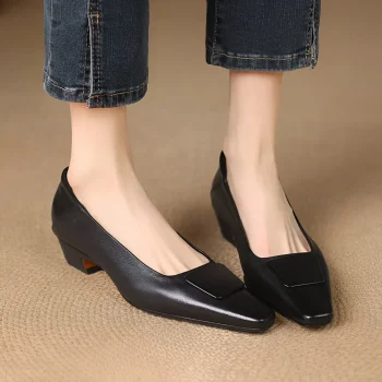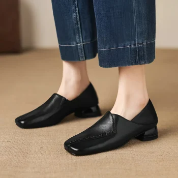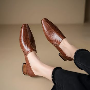 Spring Women’s Chunky Heel Square Toe Loafers – Slip-on Leather Pumps