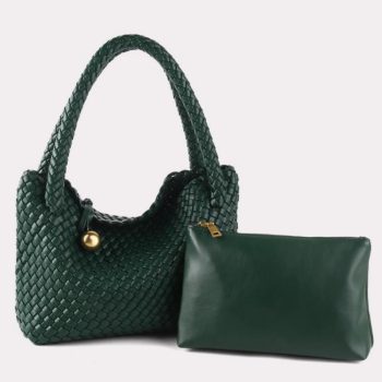 Vintage Woven PU Leather Shoulder Tote with Golden Bead Detail