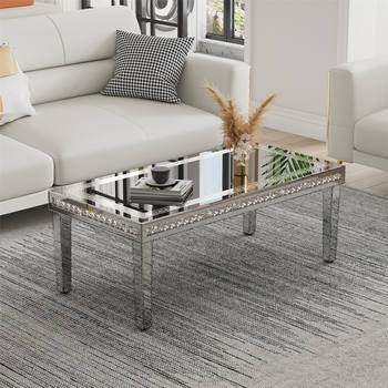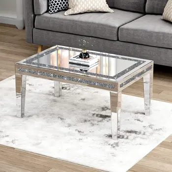 Silver Mirrored Coffee Table with Crushed Crystal Border – Rectangle Centerpiece