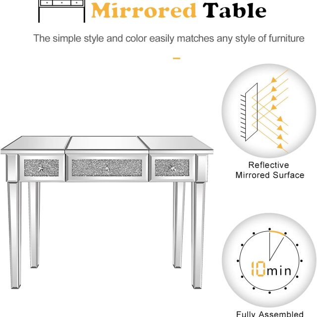 This versatile vanity desk is not only a practical piece of furniture, but it also serves as an eye-catching centerpiece in any room. Whether placed in a bedroom for a makeup station or in the entryway as a chic accent piece, it enhances the room with its reflective mirror finish and sparkling crystal accents. The sturdy construction and high-quality materials ensure that this desk will remain a functional and beautiful addition to your home for years to come. Its sleek design makes it easy to pair with a variety of other furniture styles, ensuring it fits perfectly into any space.
