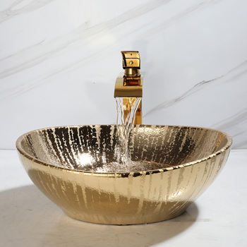 Elegant Gold Ceramic Oval Vessel Sink with Faucet and Drain Combo
