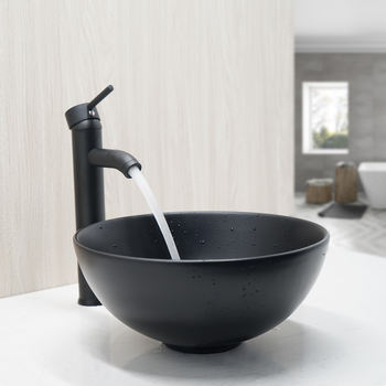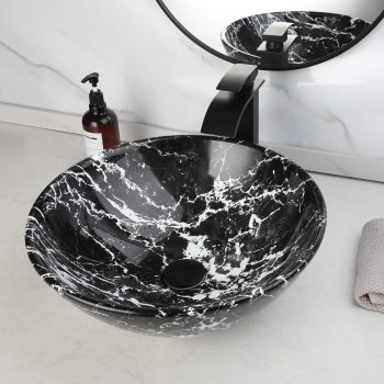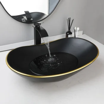 Luxury Ceramic Vessel Sink with Black Waterfall Faucet and Drain Set