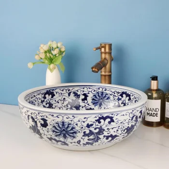 Elegant Blue and White Porcelain Vessel Sink with Faucet and Drain Set