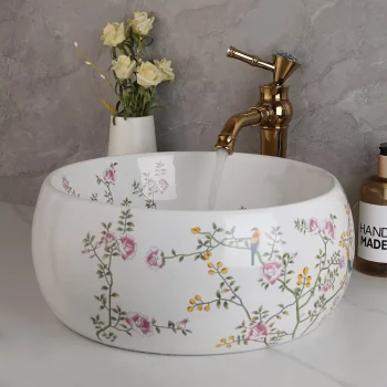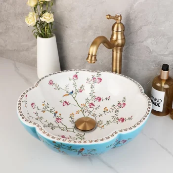 Elegant Ceramic Flower & Bird Vessel Sink Set with Gold Faucet – Round Countertop Basin